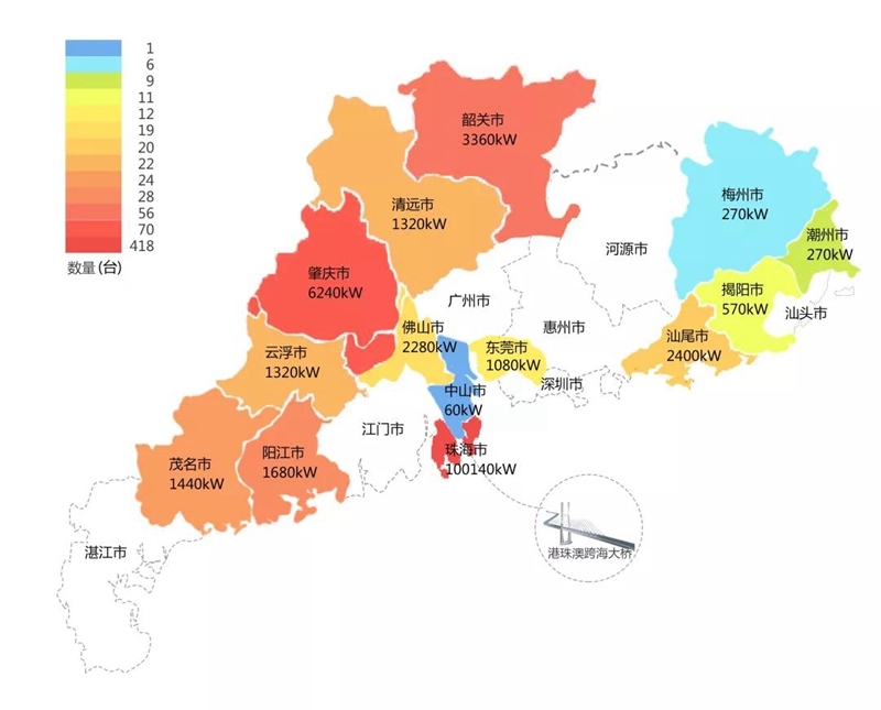 2018年,在港珠澳大桥充电桩项目中,深圳市纬域科技有限公司在港珠澳大桥珠海端口岸人工岛搭建的充电管理平台及电能量采集终端,为大桥的绿色运营和电力保障提供技术支持。除此之外,仅广东省内,深圳市纬域科技有限公司充电桩涵盖肇庆、珠海等14个城市,具体分布情况如下图所示。